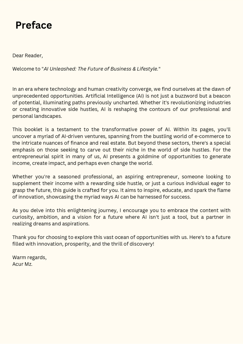 Unlock the transformative power of Artificial Intelligence with this comprehensive guide. Whether you're charting a new business path, exploring side hustles, or simply curious about AI's potential, this booklet is your essential companion.